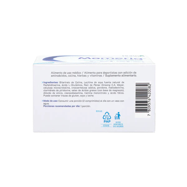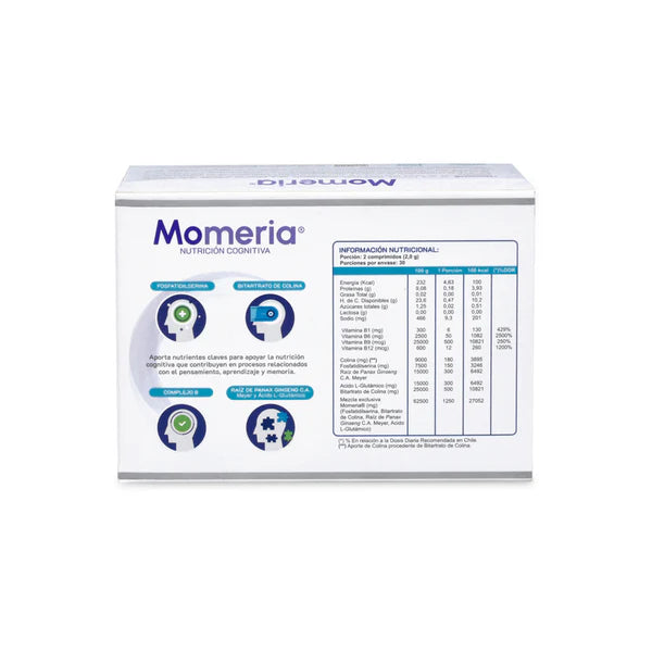 Momeria® contiene Fosfatidilserina, Bitartrato de colina, Panax Ginseng, Ácido L-Glutámico y Vitaminas del complejo B (B1, B6, B9 y B12), ingredientes ampliamente utilizados para apoyar procesos cognitivos y el funcionamiento normal del sistema nervioso.